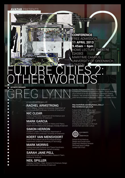 Future Cities 2 is an all day event held by the AVATAR (Advanced Virtual and Technological Architecture Research) group, a cross-disciplinary, research active architectural design group that examines the impact of emerging technologies on the built environment and wider culture.