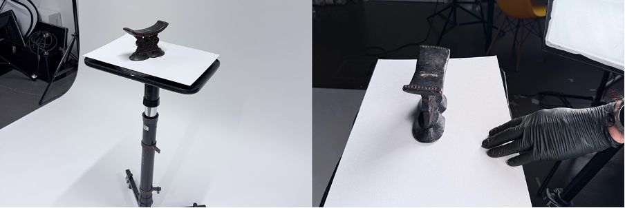 The carved wooden artefacts – the headrest and combs – are more straightforward, but the shallow relief and worn surfaces still require dense coverage to avoid soft or ambiguous geometry in the resulting models. In practice, capturing more images than strictly necessary consistently results in more reliable reconstructions.