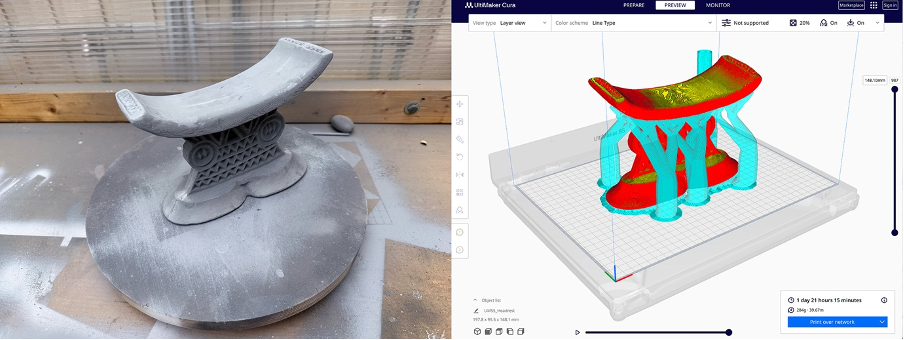 The headrest is printed on a more conventional FDM printer, which extrudes molten plastic in layers, building the object up gradually. It is printed in two halves and then fixed together. The visible layering produced by this method echoes carved tool marks, making it a surprisingly appropriate choice for a wooden object.