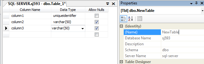 2. Enter the column names and data types you want in your table then under ‘Properties’ in the ‘Identity’ section, for the ‘(Name)’ value enter a name for your table, save the changes you have made to create the table, then close it.