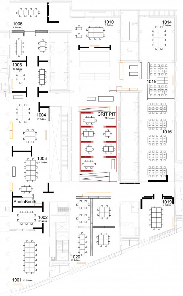 The studio walls / tables will be reset to this default layout each weekday morning. Classes have priority for use of walls and furniture – only take tables and chairs after classes have started and only if they are not being used by those classes.