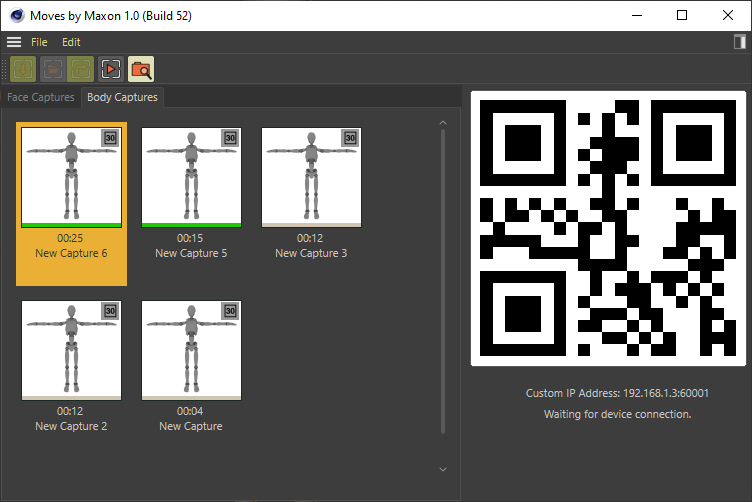 Back in the iPad app choose the C4D icon and point the camera at this code – if the network connections are ok then you will see your captures stacked up under the Body Captures tab