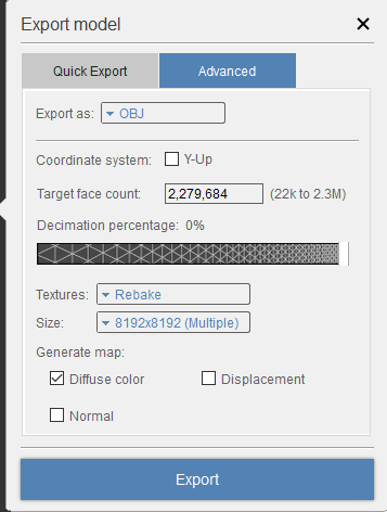 To export this model for use in, for example, Rhino do a QUICK export; export for Blender (OBJ). Medium setting is likely to be fine.