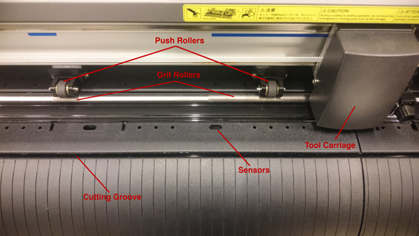 - Position the push rollers inside the edge of the vinyl. The push rollers have to be positioned above the grit rollers to avoid movement when the vinyl cutter is cutting.