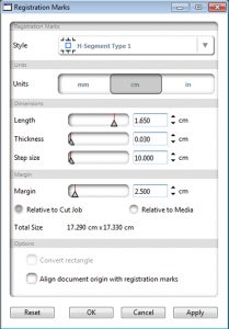 This will bring up the registration Marks window where you can select your style of registration mark; the length (important for longer job designs) and thickness (important for jobs with lamination); and the space between the cut path and the registration marks.