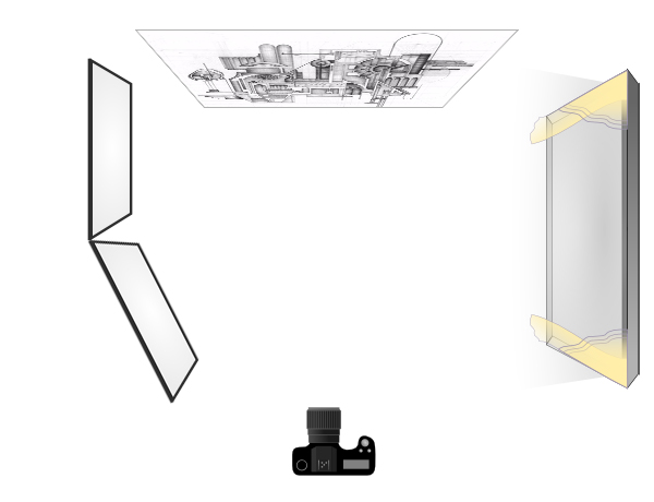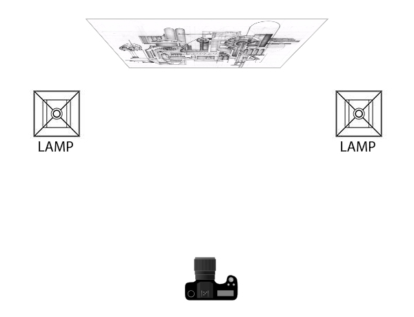 • Setup: The simplest setup is to lay your work on the floor and hold the camera above and centrally. If you work is large (A1 above) it may not be possible to be far enough away from your work without using a wide angle lens (35mm or below). In this scenario it may be better to mount/tape your work to a wall, this will allow you to keep your camera perpendicular whilst allowing you to stand further back and lessening the chances of distortion.