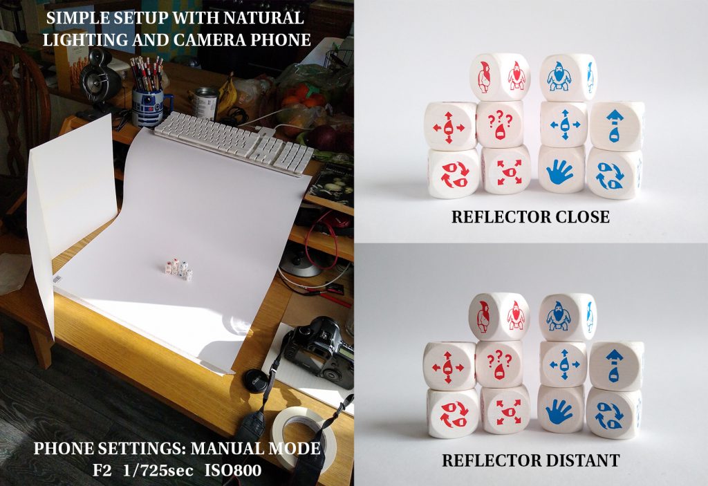 Here is a setup I made at home on my desk. For the reflector I taped together four sheets of white card that came with some comics I bought. The background is a sheet of craft paper from The Works, its white on one side and red on the reverse…