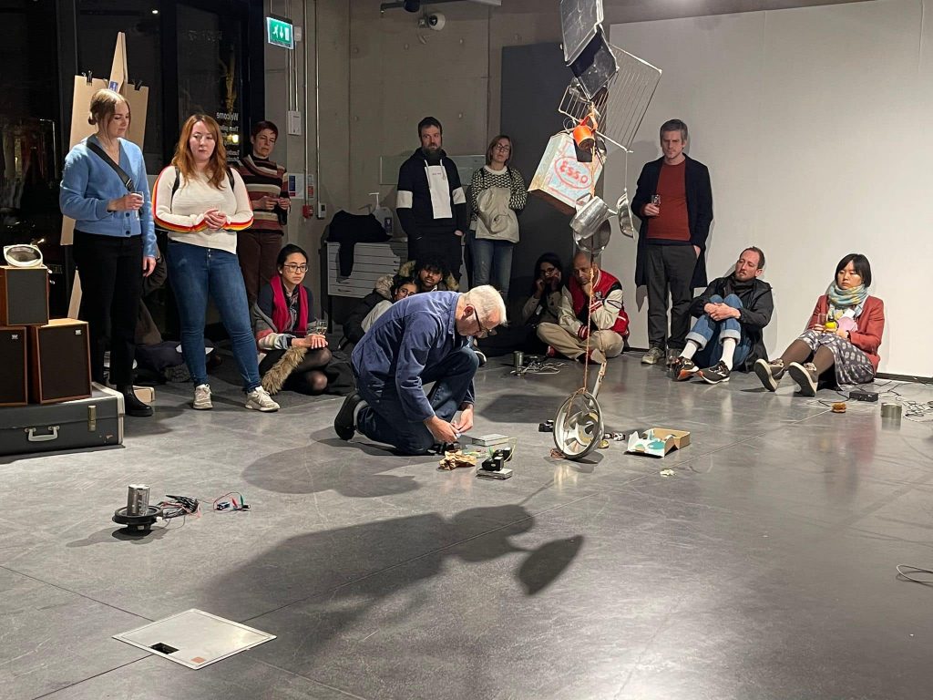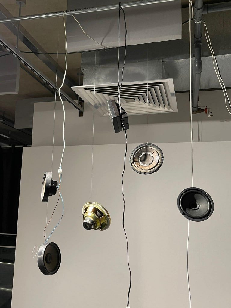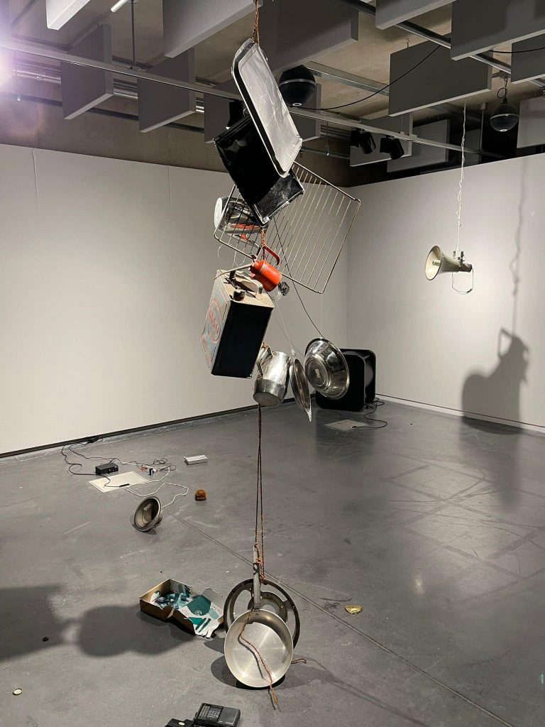 A cacophony of rhythmic stutters polarising with brutal deep bass – interrogating the noise! Object Noise Clusters made from everyday objects – pots and pans, oil can, oven shelf, coffee pot, clock gongs – are hung from the ceiling and intermittently vigorously shaken by motors. These are placed next to DIY loudspeakers strung-up creating an intense dialogue between acoustic and electronic sound. While rotating speaker horns bounce clicks around the space. Ink drips from a cannula onto a piece of out-stretched vibrating ‘noise’ paper. Watch the artwork unfold as a preview night performance (see panel below).
