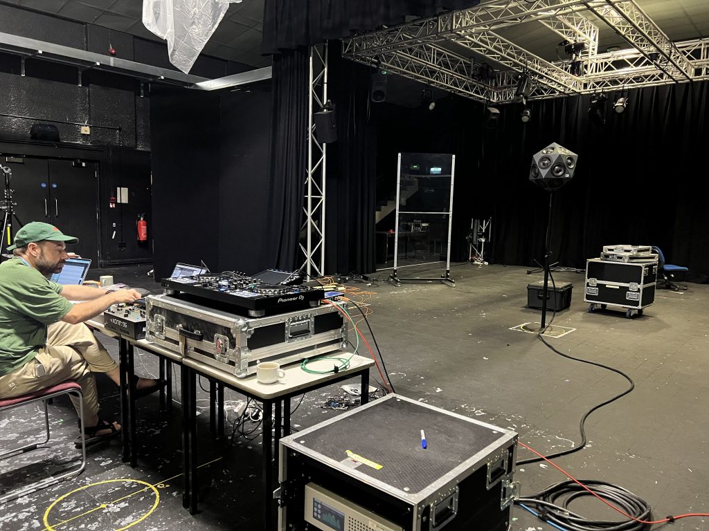 The first few weeks I was working with Dr Brona Martin and technican Liam Frizzle, both in the theatre space and the Spatial Audio Lab, finding ways to work with the various multi-channel sound systems. My turntablist practice provides some challenges with working with spatial audio as it is intrinsically tied to the use of a stereo DJ mixer and hardware effects units. A previous approach, developed for a very specific piece in a specific place, proved not to translate well. With the guidance and support of Dr Martin and audio technician Liam Frizzle, I was able to develop a way of working, using all of the speakers in the Bathway Theatre including the IKO 3D Loudspeaker. This approach was more concerned with building a virtual sound system, accentuating the sense of a sonic ‘depth-of-field’ I already use in my work, rather than using lots of individual sound sources.