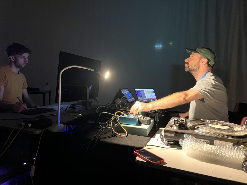 After a weekend working in his studio in Bristol, Will Young joined for the final week when we had 4 continuous days in the theatre. The initial plan with the visual aspect was to work entirely in Unreal Engine, as this is the platform that Will works with to create fixed pieces of digital art. However, it became rapidly apparent that Unreal does not lend itself easily to being an improvisatory performance paradigm and things that were relatively easy to achieve in other platforms were far from straight-forward. We quickly decided to limit the use of the software to adapting his custom particle engine into a audio-visual 360 granular delay effect, and Will concentrated his efforts on using various cameras on live objects in the space – primarily the set of damaged and degraded vinyl records I had extracted from my mum’s shed after 20 odd years that I had been using for the audio aspect. We then worked closely with the Bathway Theatre visual technician Riley Pennycard to control the lighting in the space to mirror the depth-of field approach I was taking with the audio.
