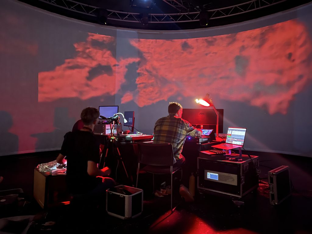 The initial Arts Council DYCP funding award was to undertake some r&d with digital video artist Will Young (a longtime friend and collaborator), Dr Brona Martin and the SOUND/IMAGE technical team during a residency at the Bathway Immersive Theatre. The expectation was that Will and myself would run some tests and find some ways to work with each other in the space. We would go away to conceive and develop a full immersive ‘show’ after the residency as a separate undertaking. However, the experience proved to be deeply collaborative and generative, resulting in an emergent approach to AV improvisation that was significantly more well-formed aesthetically and conceptually than we could have hoped for.