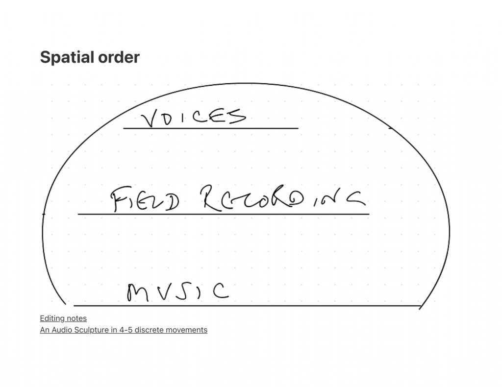 The interviews were transcribed, edited and voiced by AI ‘actors’ to anonymise the initial responses and to add an air of uncanny to the work. Taking Buckminster Fuller’s concept of the geodesic dome as its visual inspiration, the resulting sound sculpture consisted of a multitude of voices arranged in a virtual dome-like structure above the listener’s head, accompanied by ambient musical soundscapes and field recordings layered beneath (see diagram).