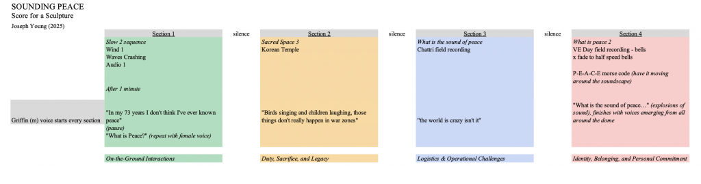 My latest project Sounding Peace centres around conversations with military veterans and their experiences of peacekeeping or peace enforcement missions, and how this has affected their ideas about peace in the world. Interviews with veterans and families took place in person and online, in partnership with veteran groups, museums and military heritage scholars. The aim being to reframe sites of memorialisation (war memorials, museums) through sounding the voices of peacemaking, as expressed by veterans.